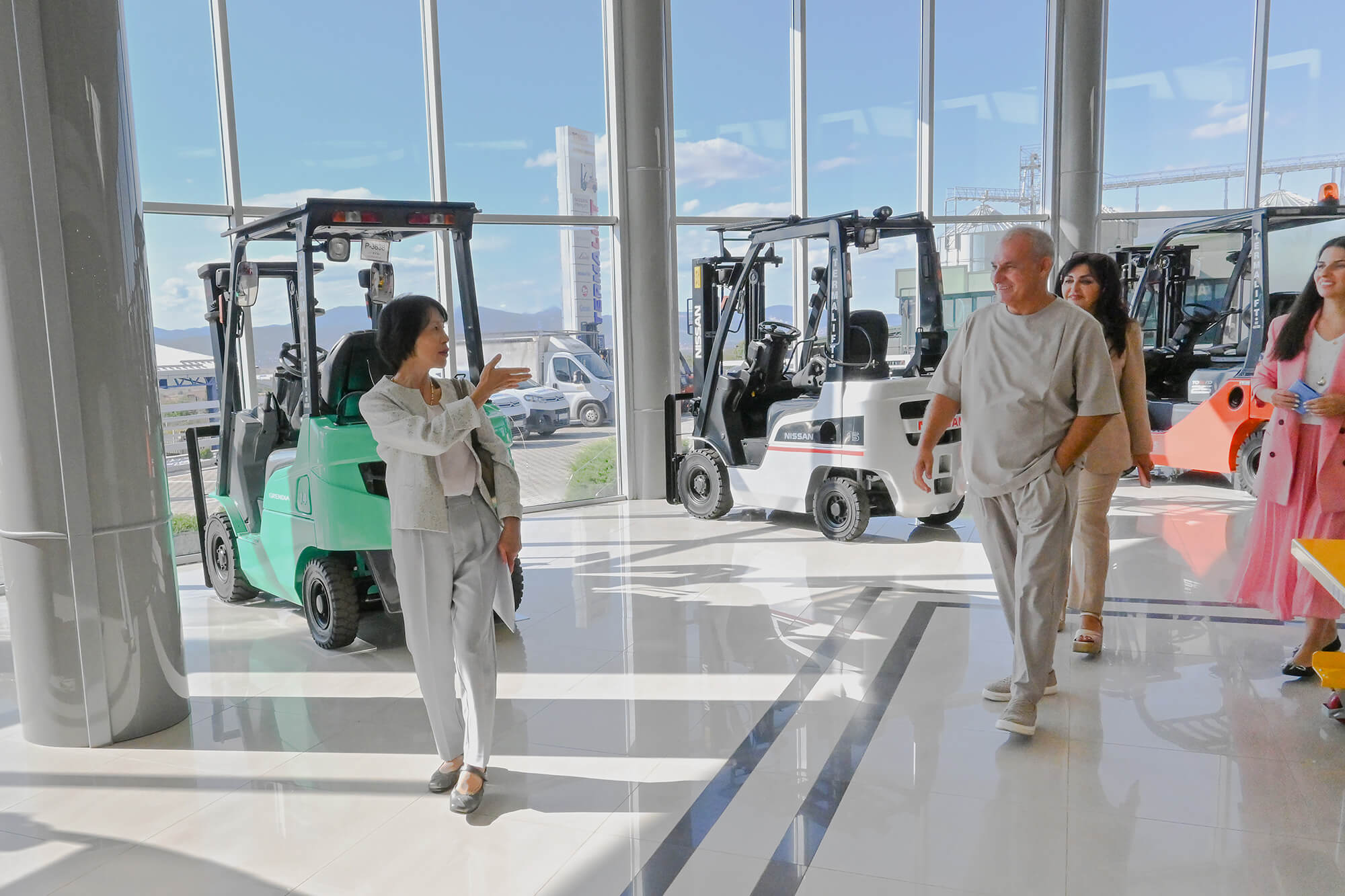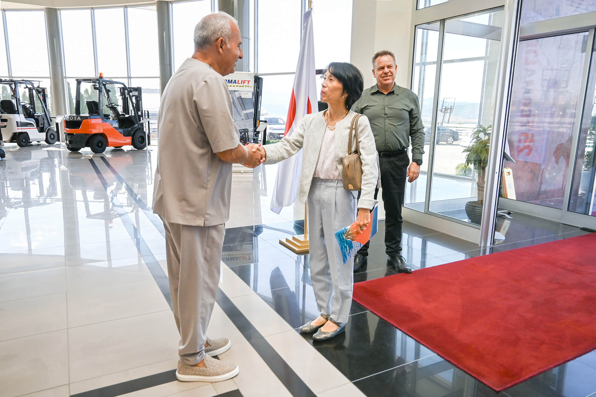 За време на посетата, амбасадорката Кавахара се запозна со производните и сервисните капацитети на компанијата, како и со најновите решенија од нашето портфолио на вилушкари и платформи.